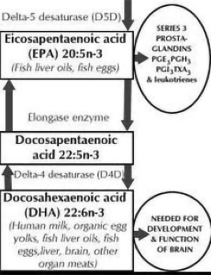 Of particular significance for this discussion on the omega 3 fatty acids is eicosapentaenoic acid (EPA) and docosahexaenoic acid (DHA), which are derived in the largest amounts from cold-water fish oils. EPA seems to be a potent inhibitor of the inflammatory cascade, as it is a regulator of enzymes that control the pathway of omega 6 fatty acids to eicosanoids. EPA also inhibits delta_5_desaturase and thus decreases arachidonic acid production in the dog and man, but not the cat. The arachidonic acid pathway produces leukotrienes and prostaglandin E_2 (PGE_2), which produce inflammation.